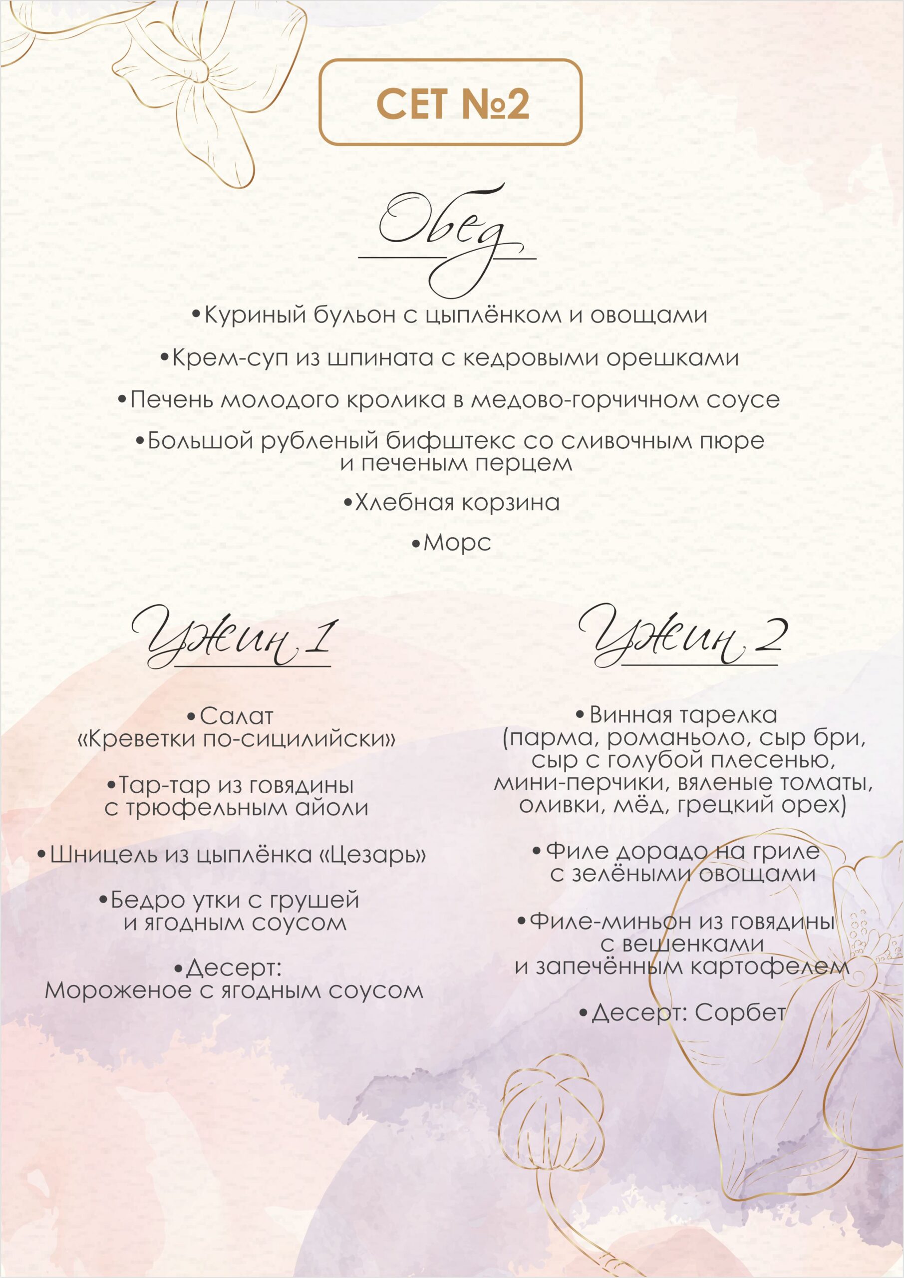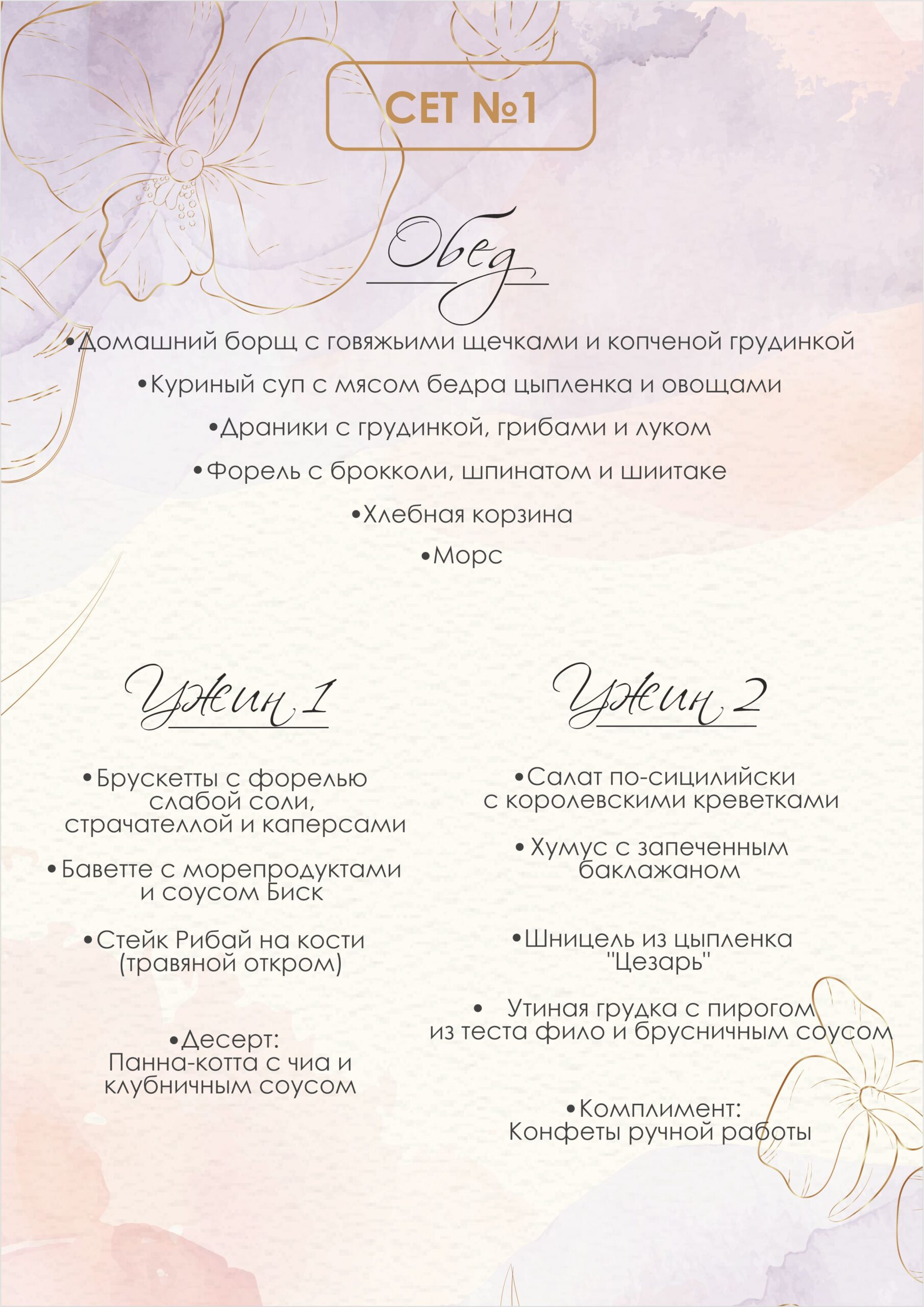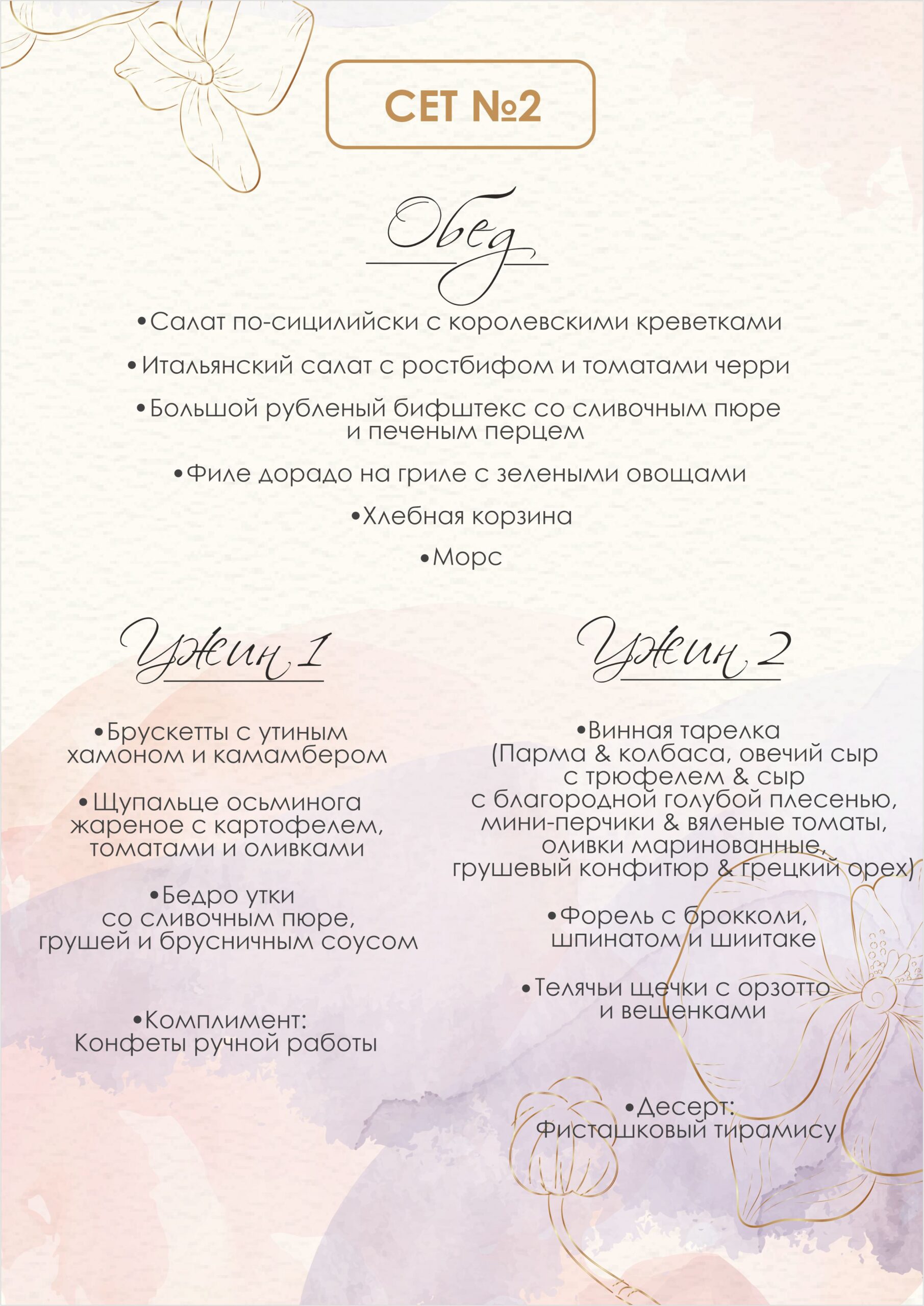 — обед и 2 ужина в период проживания для двоих по сет-меню на выбор (сет 1 и сет 2)